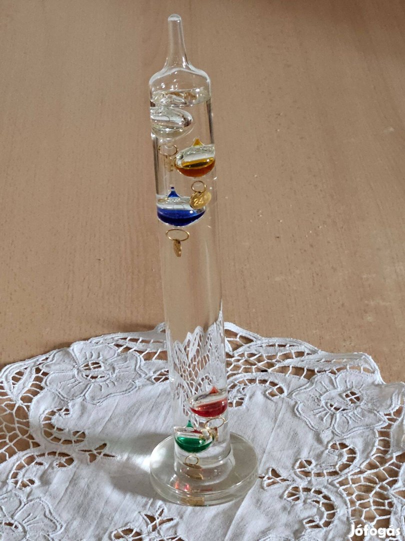 Eladóvá vált a képeken látható Galilei hőmérő. Szobahőmérséklet stílusos kijelzésére szolgál. Elegáns, folyadékkal töltött üveghenger. Öt színes különböző súlyú, gömb lebeg benne. Nappaliban, irodában ajándéktárgyként is népszerű. Magassága: 28 cm, átmérő: 50 mm.