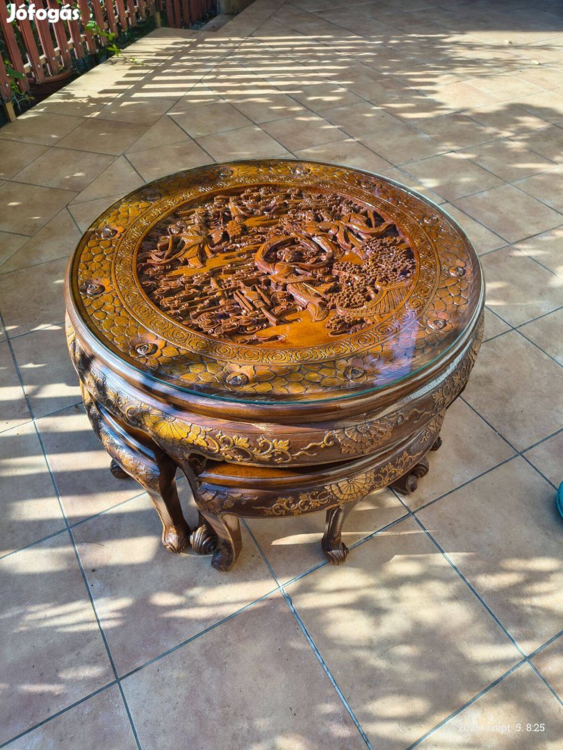Eladó 110 ezer forintért a képeken látható, Hong Kongban, a '60-as években kézzel faragott, rendkívül, látványos tea asztal, hozzávaló 4 kis székkel. Átvehető Újpesten. Nem postázom!