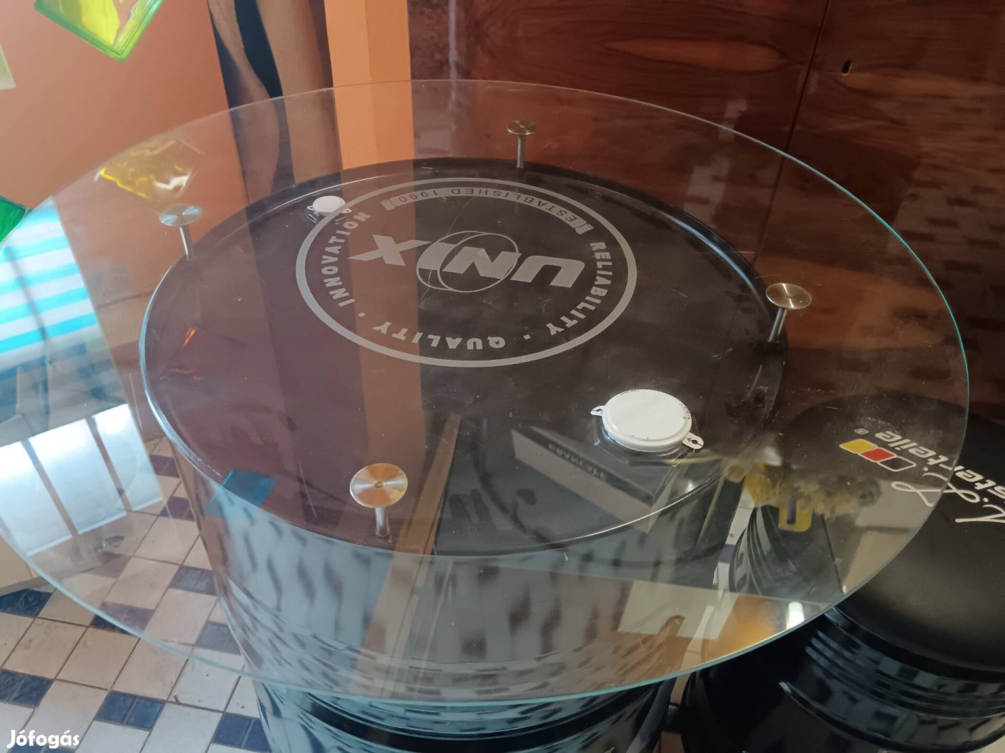 Eladó a képen látható Unix feliratú, reklám célra gyártott, üveglap tetejű, hordó asztal ~s a hozzá tartozó hordó ülőke párnával. Szinte teljesen új, alig volt használva. Posta kizárva.