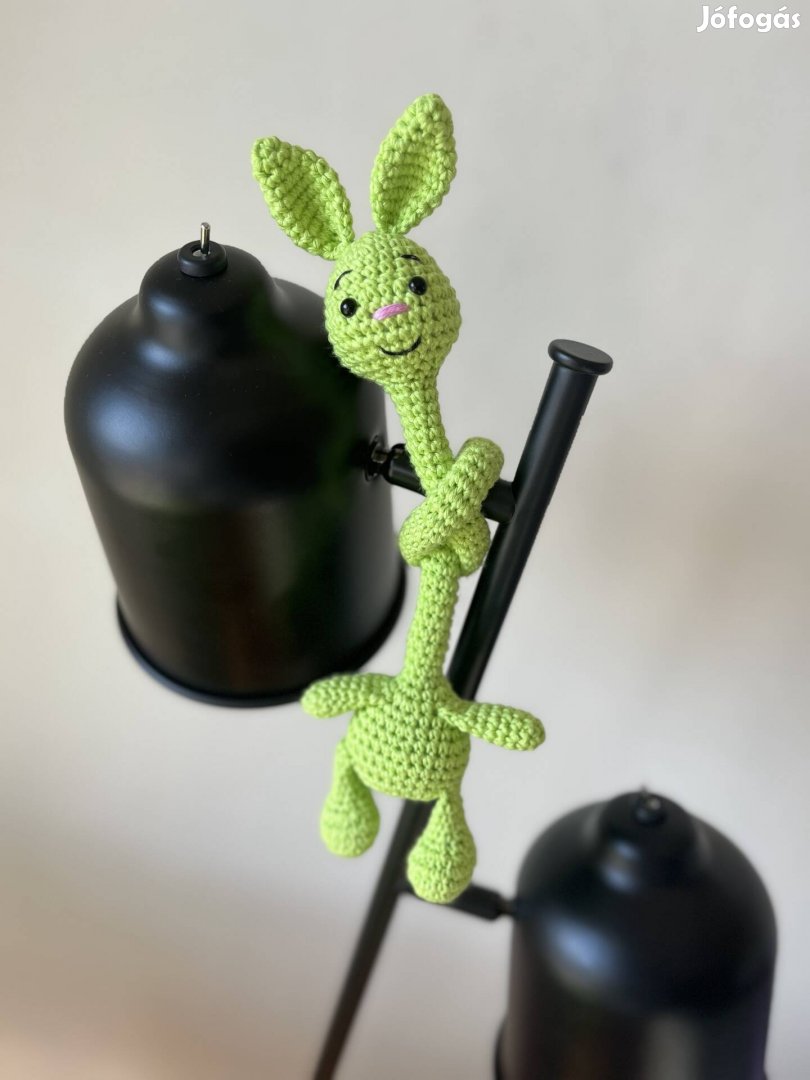 Horgolt nyuszi táskadísznek vagy az íróasztalra a lámpára tehető dísznek. Hossza kb. 43 cm.