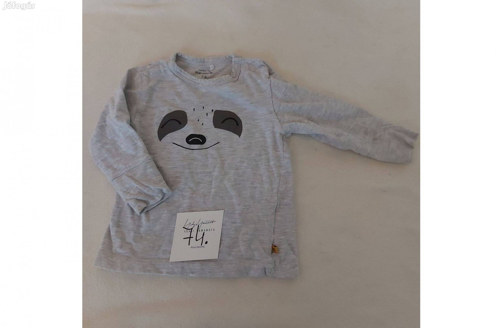 74-es méretű, szürke alapon mintás, hosszúujjú kisfiú póló.