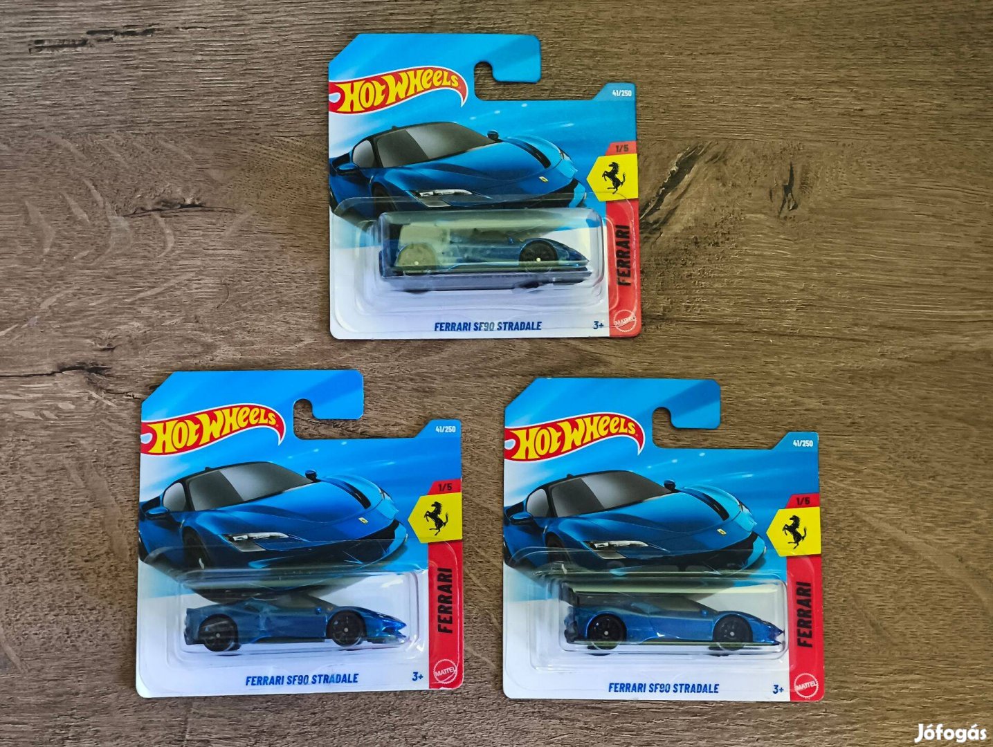 Eladó a képen látható 3 darab Hot Wheels Ferrari SF90 Stradale kék színű kisautó.