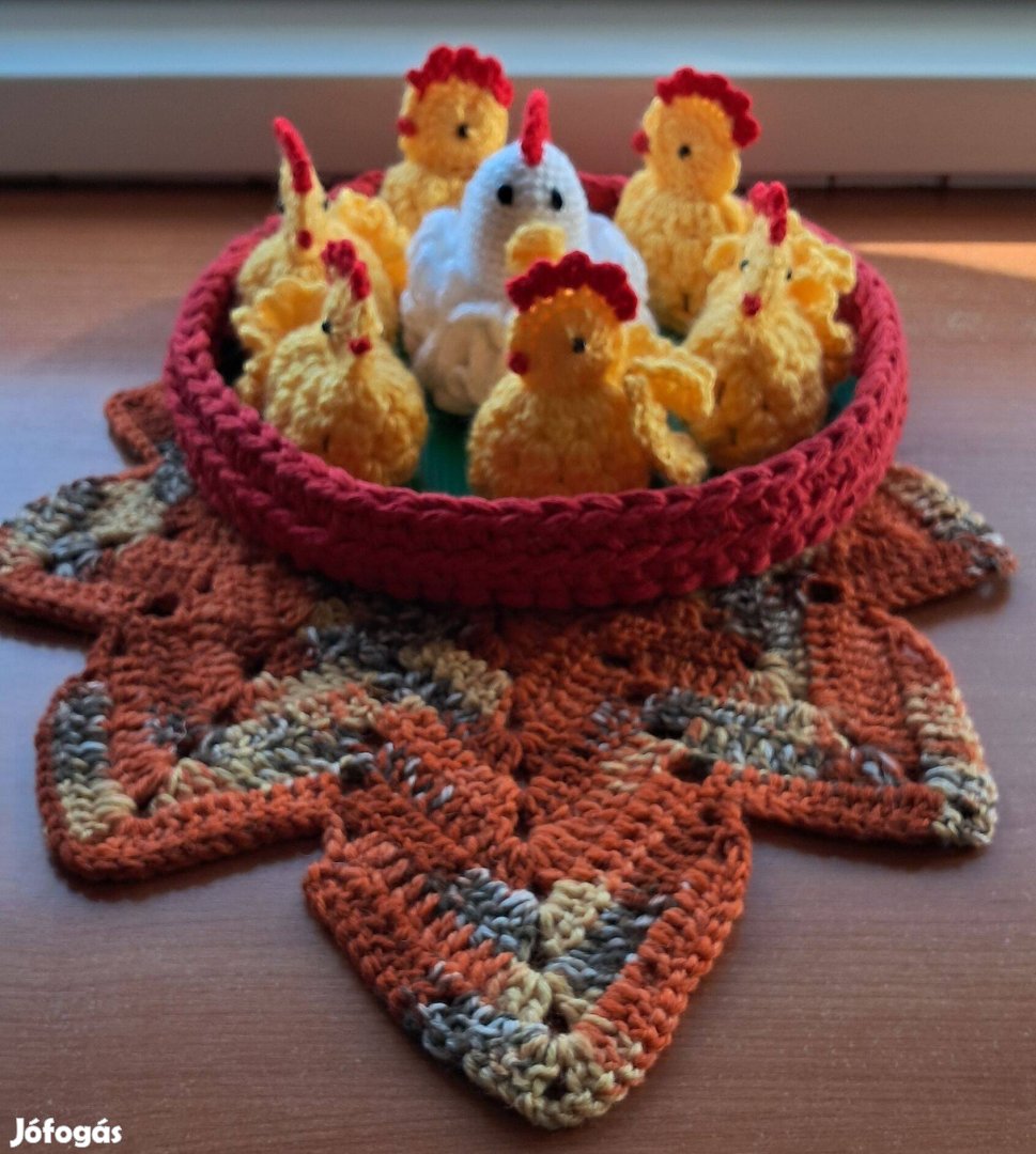 A dísz tartalmazza: a kosarat a tyúkot, 6 db csibét és a falevél terítőt.