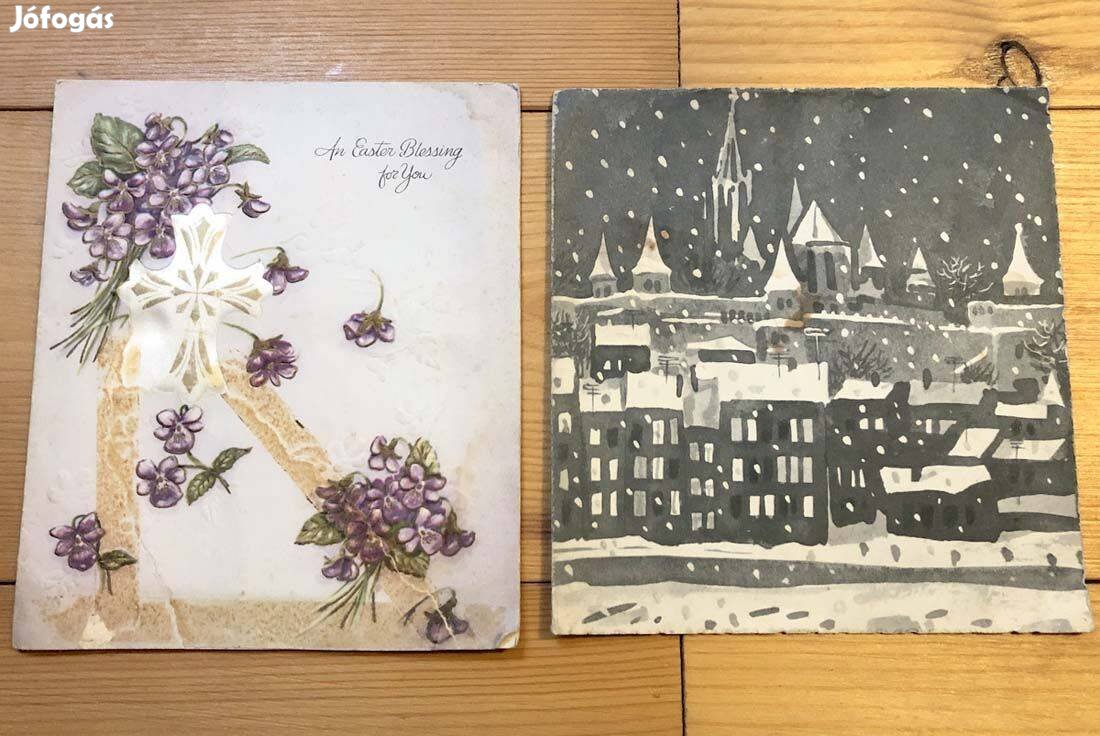 Képeslap gyűjtemény felszámolása miatt eladó a képeken látható külföldi húsvéti és magyar karácsonyi üdvözlőlap együtt. Eredetileg borítékkal hozták forgalomba, az már nincs meg hozzá. A külföldi javított borítóján selyem kereszt látható. A kettő együtt 600 Ft.
