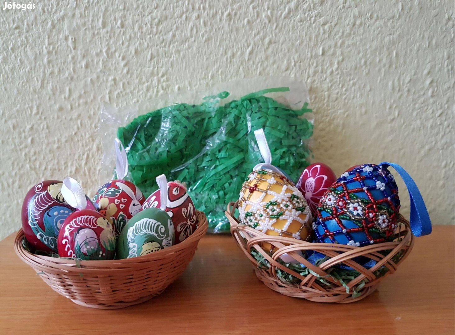 Az összes közül 7 darab fa, 2 darab gyöngydíszítéssel/gyöngyfűzött díszítéssel a tojás körül, és 1 db festett, üreges, szalag dísszel.