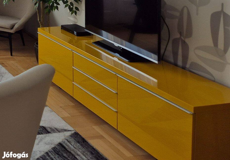 Ikea Besta Burs TV állvány/szekrény eladó. Élénk sárga, fényes felületű, lábakon áll, rendkívül látványos. Már nem forgalmazza az üzlet. Két oldalt mély fiók van, középen 3 polc, lehajtható előlappal. A középső előlapon kb 1 cm alig látható karcolás. Mérete: 180x40x50 cm