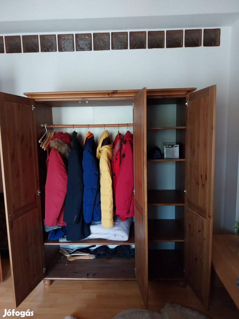 IKEA háromajtós fa szekrény, egy ajtó polcos, kétszárnyú ajtó fogas résszel, 150 cm x 62 cm x185 cm