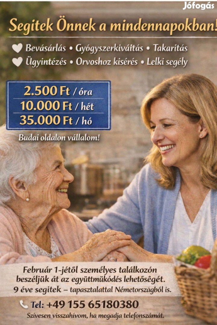 Ha heti rendszeres megbízható segítséget keresel idős szüleidnek,Budai oldalon,amiben segíteni tudok:bevásárlás,lakás rendben tartása,ügyintézés,beszélgetés,lelki segély akkor keress bizalommal,Enikő Schulz,elérhetőség:Facebook saját néven,e-mail:,tel:+4915565180380,szívesen visszahívom ,ha megadja számát!
