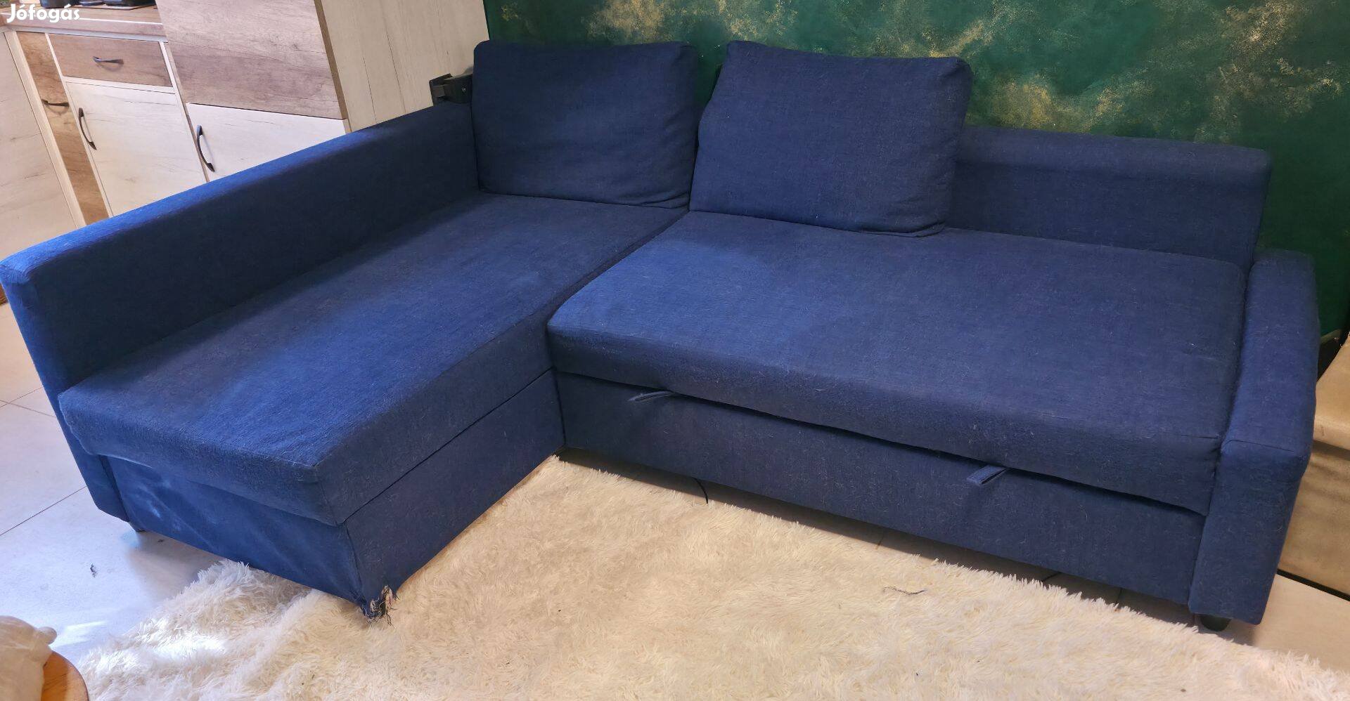 Eladó Ikeas kinyitható ágyneműtartós kanapénk, a harmadik párna megvan, de javításra szorul. Illetve az egyik sarka enyhén sérült lent a szövet.
