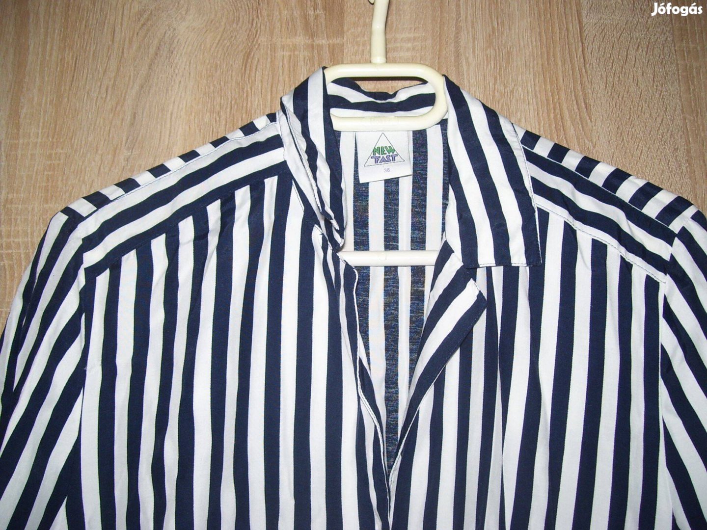 Új kiváló állapotban lévő, csíkos anyagból készült női blúz eladó. Normál galléros, elöl gombos (5 db aranyszínű gomb), egyenes fazonú, rövid ujjú.