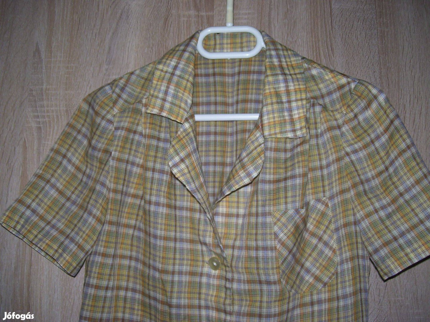 Újszerű kiváló állapotban lévő női blúz eladó. Normál galléros, elöl gombos (4 db gomb), egyenes fazonú, rövid ujjú, vállnál húzott, mellnél zsebbel.