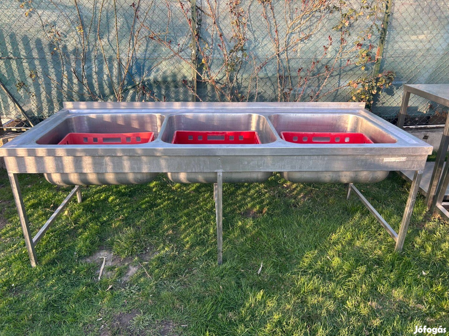 Rozsdamentes jó állapotú ipari három medencés mosogató . Alkalmas húsos láda nagy fazék bedallak mosására . Mérete : 236 x 90 x 85 cm