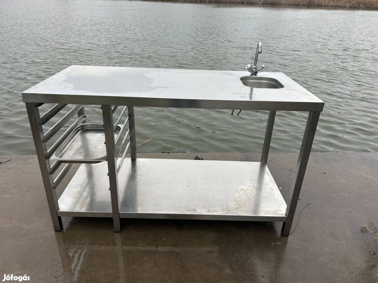 Rozsdamentes munka asztal alsópolccal 1/1 es tálcatartóval mosogatóval , csapteleppel szerelve ,állítható lábakkal , mérete 150 x 70 x 90 cm