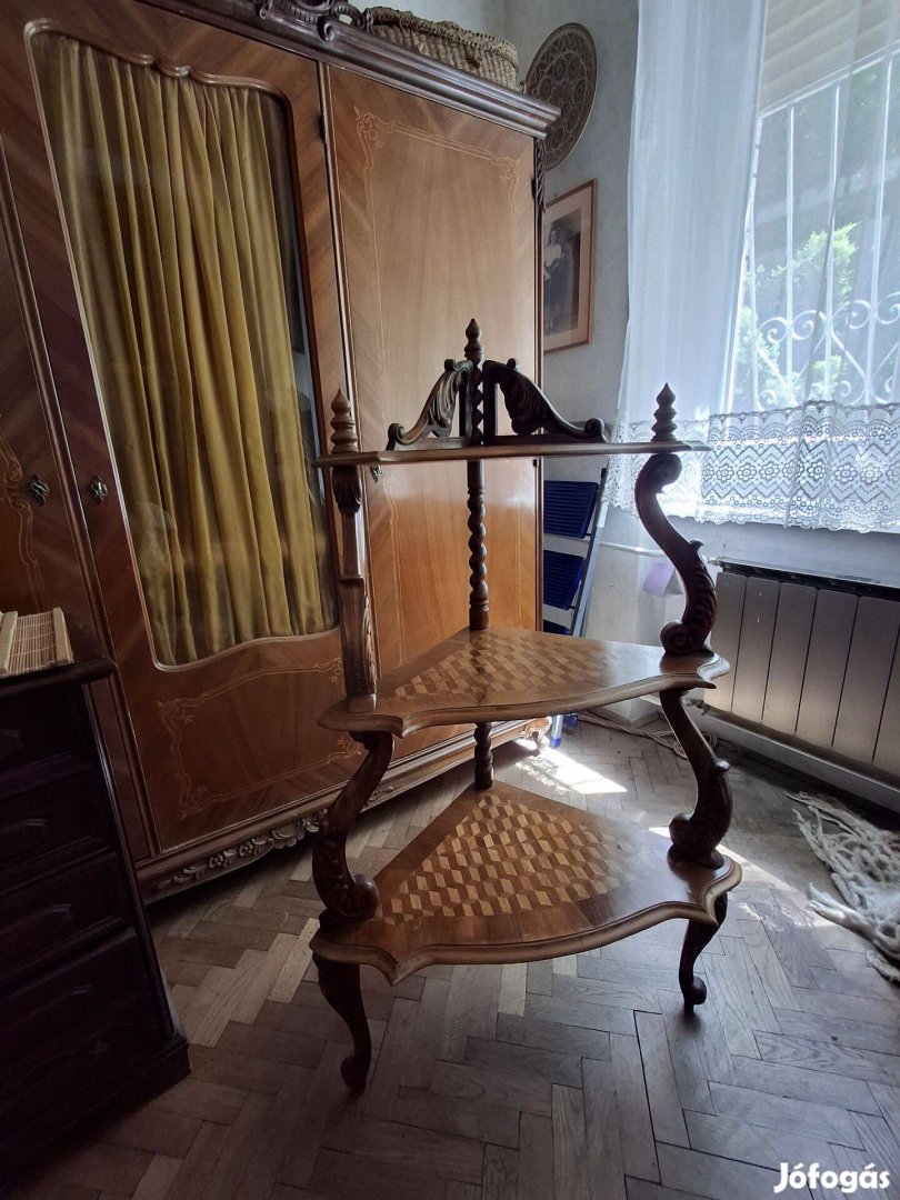 Csodálatosan faragott geometrikus intarziás háromszögletű háromszintes etager eladó. Az egyik polcon az intarziában apró hiba látható, ezt fotóztam. Minden lakásnak, stilustól függetlenül kiemelkedő disze lehet.