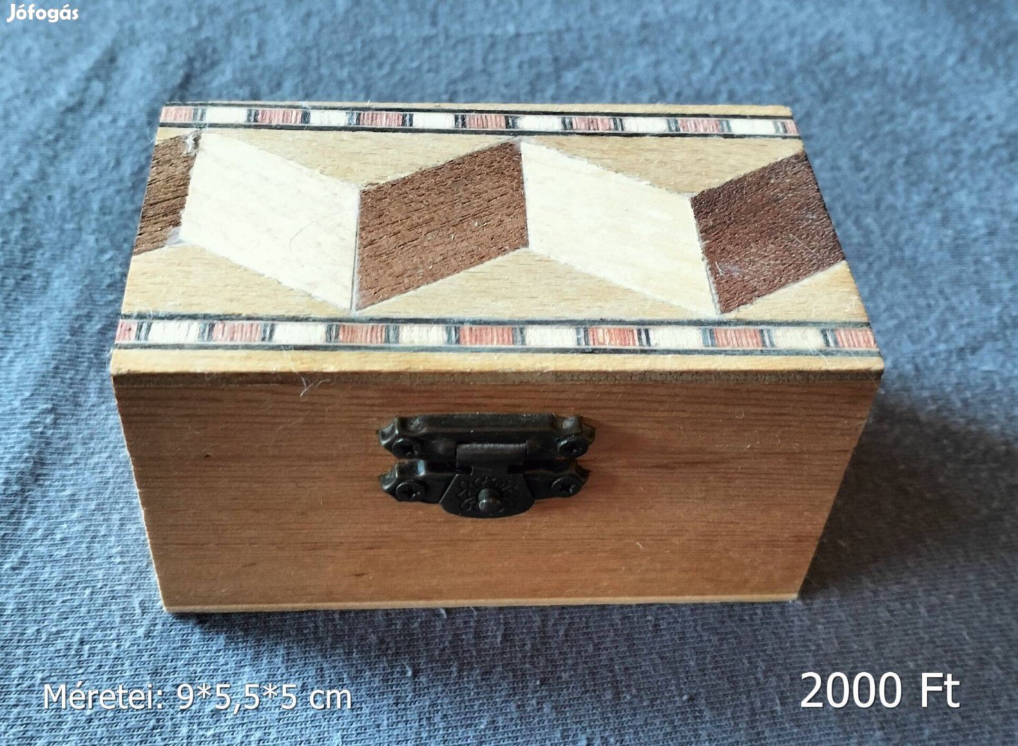 Eladó a képen látható kis fa doboz. A tetején szép, berakásos mintával díszített. Apró ékszerek, emléktárgyak vagy bármilyen kisebb kincs tárolására tökéletes.