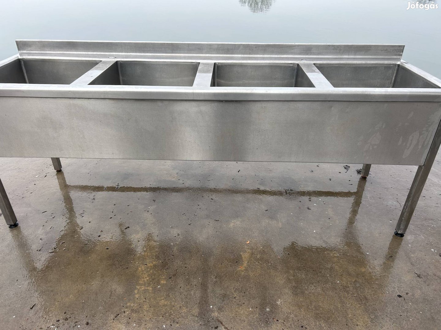 Jó állapotú Inox 4 medencés ipari mosogató , hátsófelhajtás állítható lábak . Mérete : 235 x 68 x 85 cm medence 50 x 50 x 25 cm