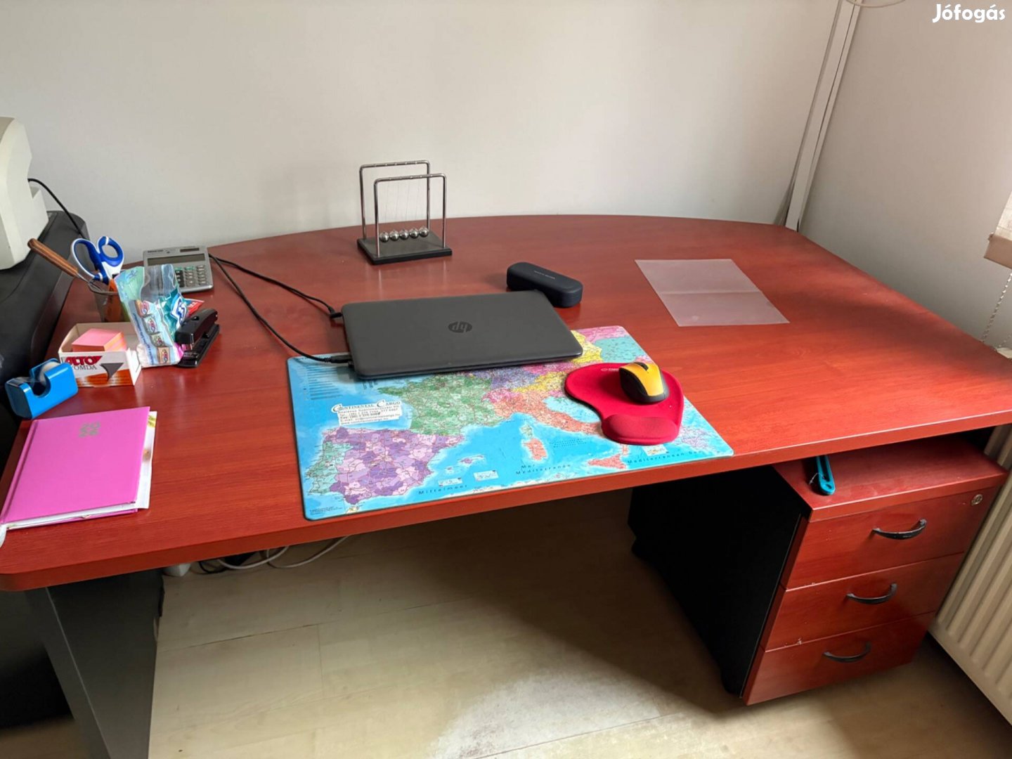 Íróasztal eladó. A képen látható 3 fiókos szekrény nincs benne az árban. Méretei: 74,5 cm magas, 160,5 cm széles, 101 cm mély