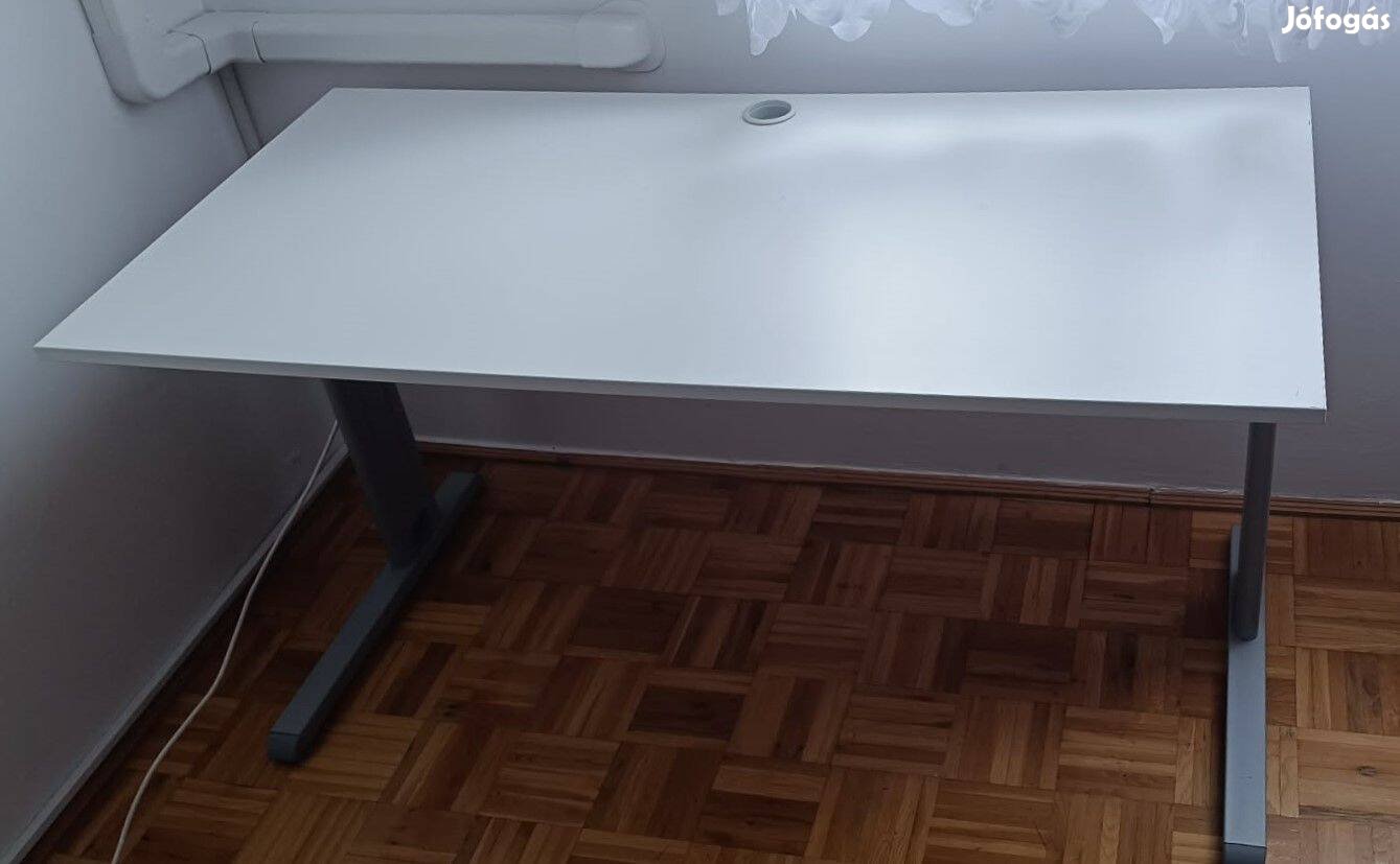 Fehér asztallap és masszív, szürke fém lábak stabil és letisztult darab, ideális otthoni munkához vagy tanuláshoz.