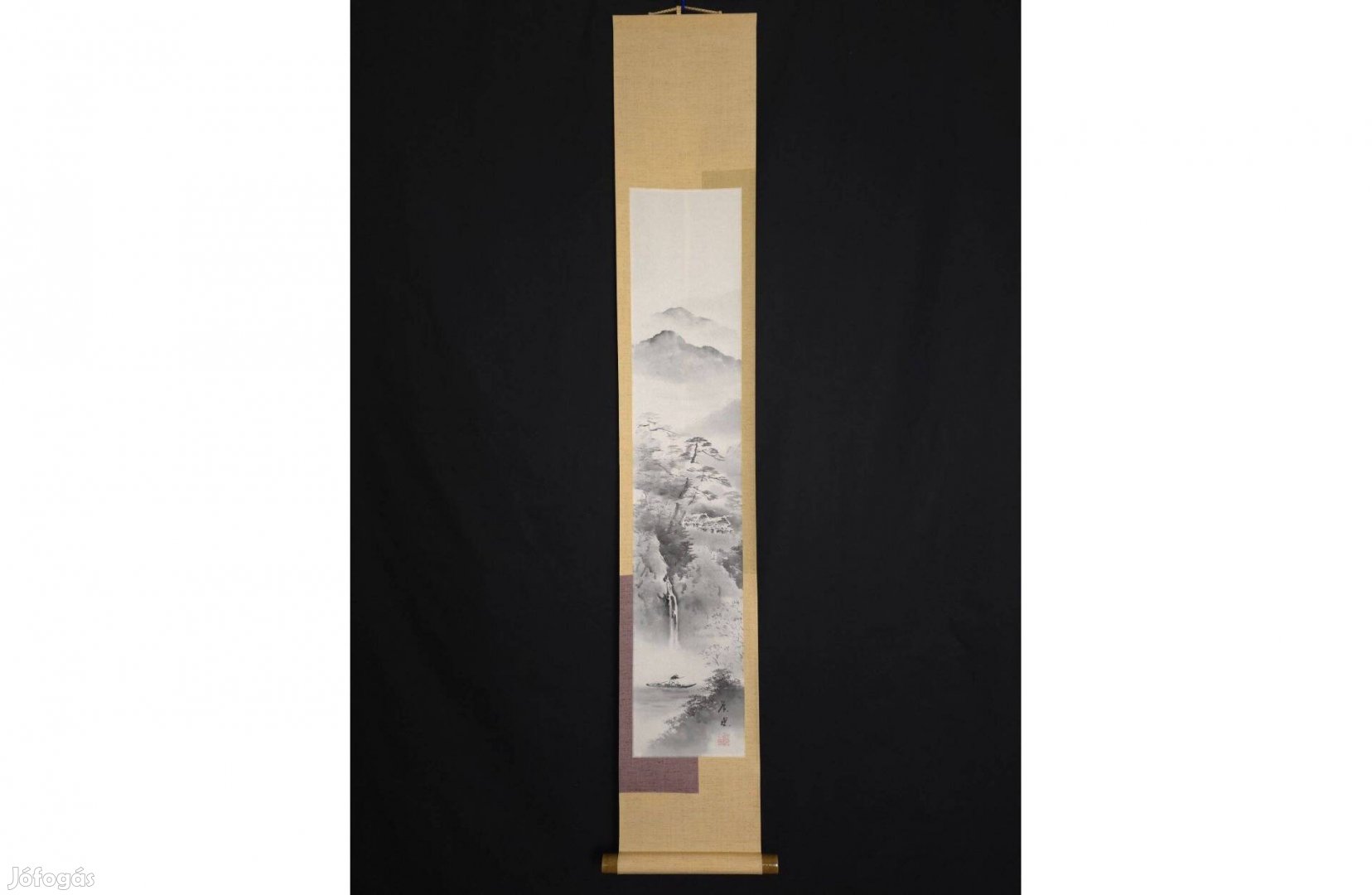Eredeti japán kakejiku, kézzel festett tusfestmény hagyományos sansui (hegy-víz) tájképi kompozícióval.