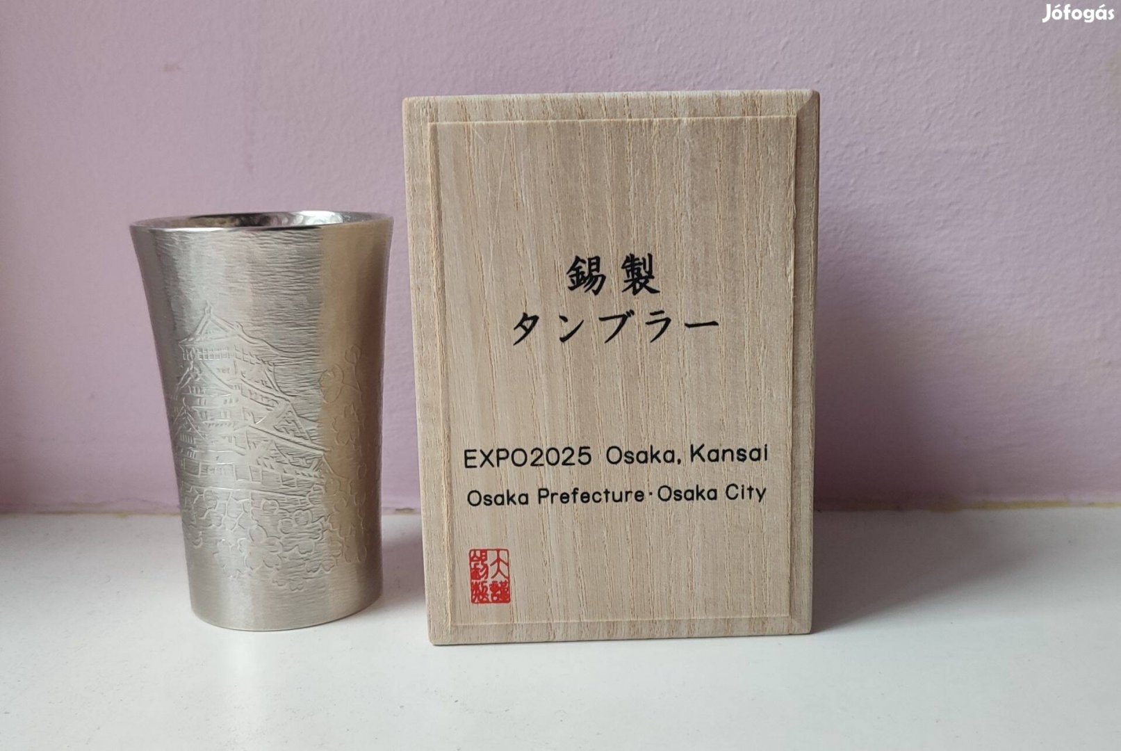 Hagyományos oszakai kézműves óm díszpohár díszdobozban. Japán motívumokkal díszítve.