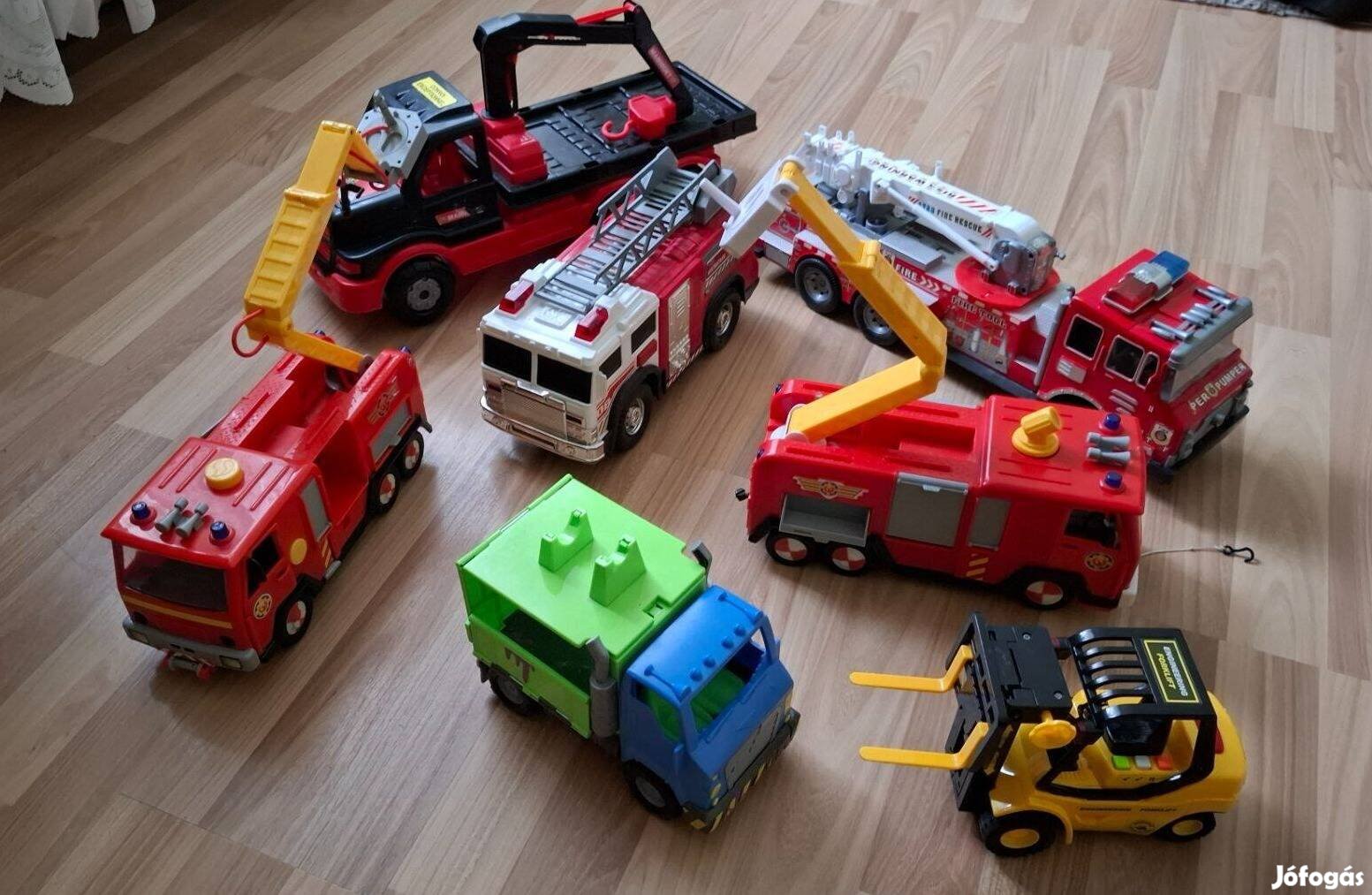 Játékautók - tűzoltó, munkagép, teherautó, lendkerekes targonca - 7 db