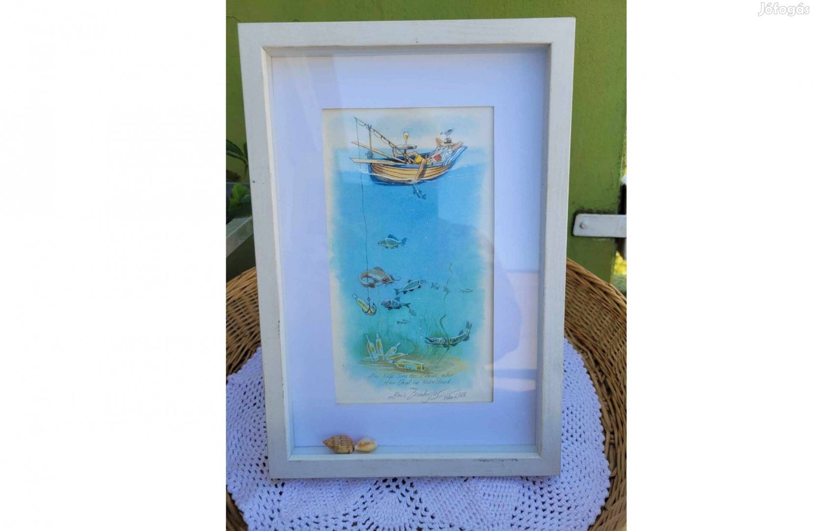 Eladásra kínálom a képen szereplő jelzett, horgász a csónakban akvarell festményt szép fa keretben, üveg lappal. Körbe fotóztam. Szép állapotban. A kereten apró festék hibák, fotóztam.
