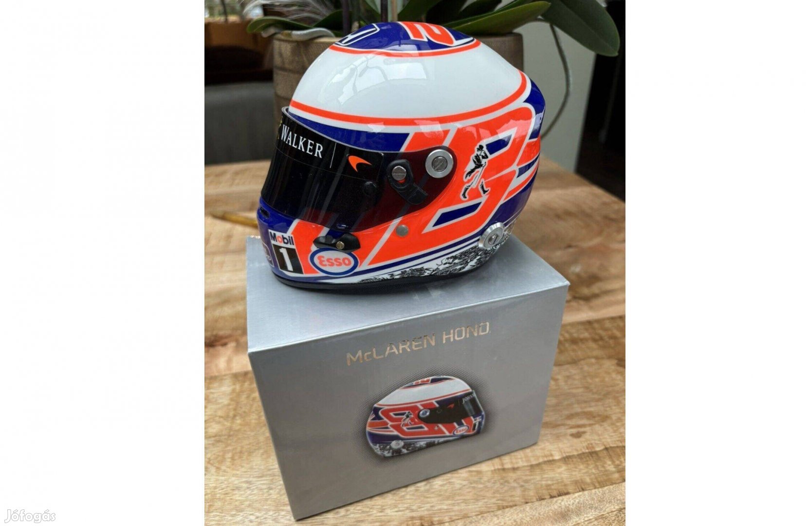 Jenson Button Mclaren Forma 1 sisak modell 2016-os szezon, újszerű és dobozban gyűjtőknek, 1:2-es méretarány.