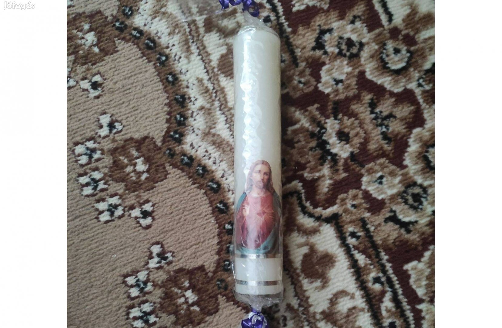 Eladó egy Jézus Krisztus ábrával díszített gyertya, kb. 24cm hosszú × 4,5cm széles.