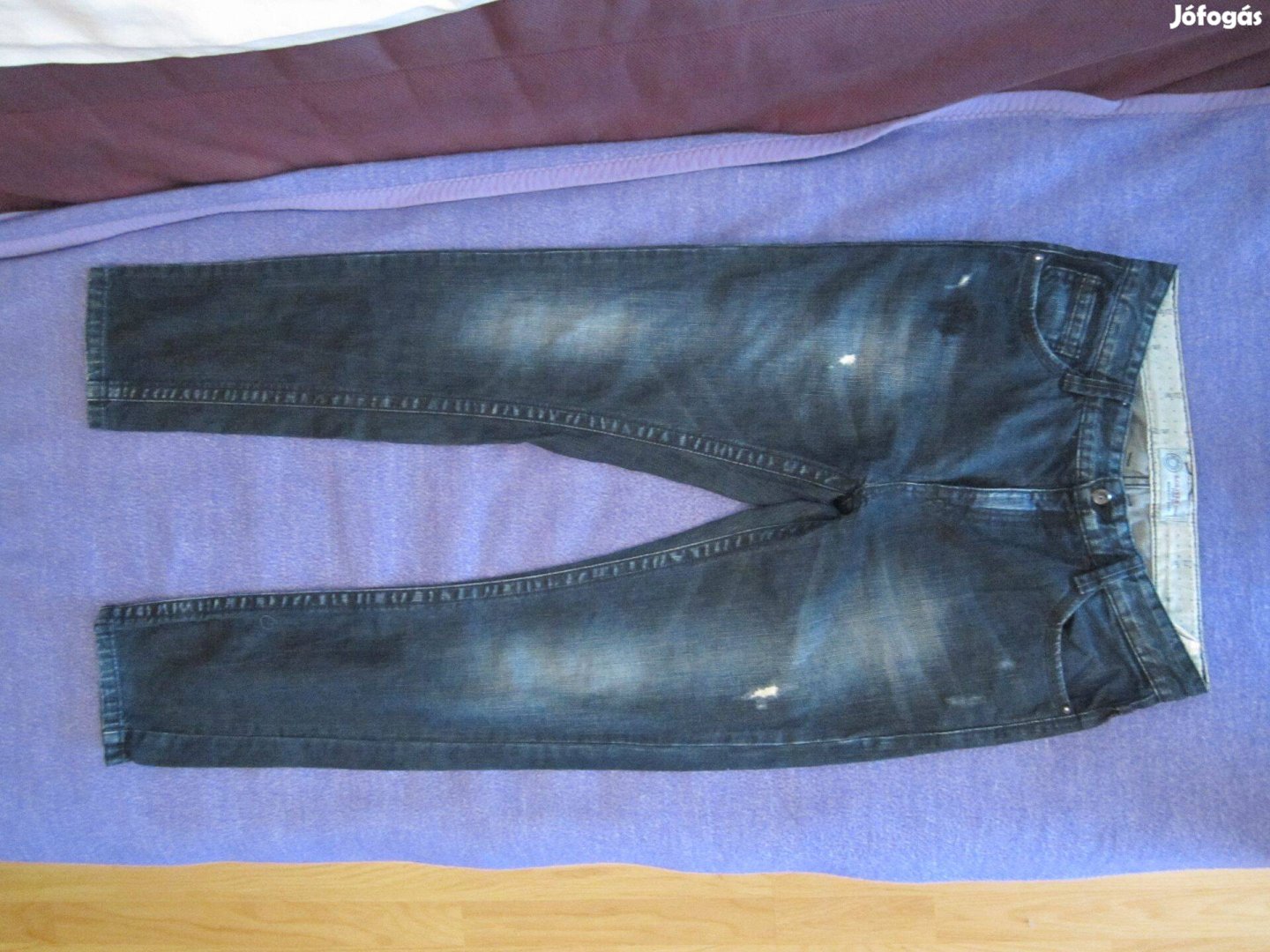 100% pamut, használt, de szép állapot, divatos (feketés mélykék) szín. Szűk szárú fazon, rendes farmeranyag, nem sztreccs. Gyárilag létrehozott koptatások/szakadások.