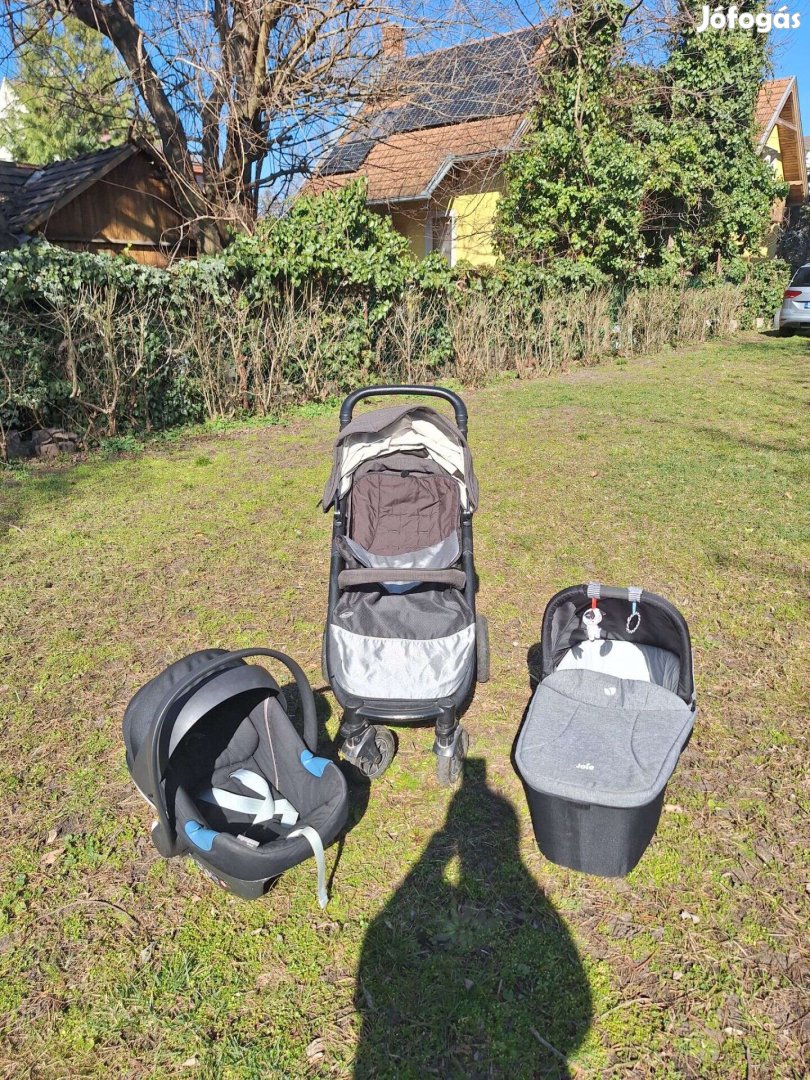 Joie 3in1 babakocsi. Részei: sportkocsi nagy, strapabíró kerekekkel és nagy pakoló résszel, ajándék esővédővel és lábzsákkal. + Mózeskosár. + Cybex Aton M babahordozó a megfelelő adapterrel. A vázon használatból eredő karcolások. Funkciója rendben van. Könnyen lapracsukható. Csak személyes átvétel Pesten.