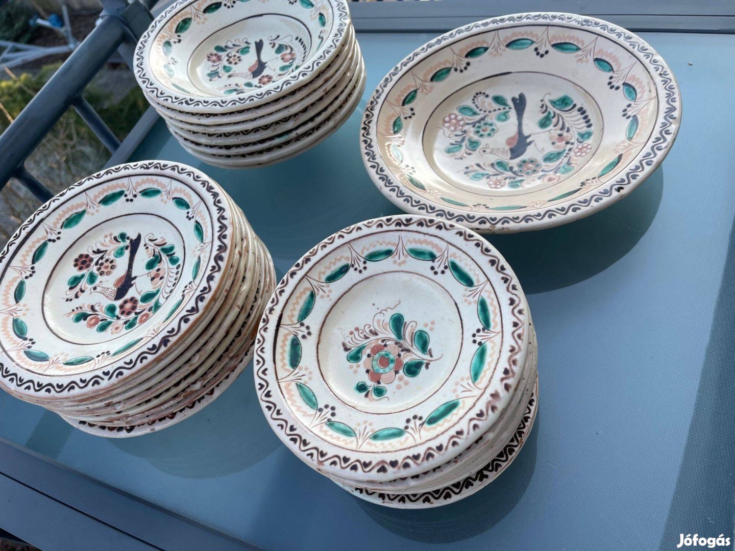 A karcagi fazekasság kiemelkedő alakjának, Kántor Sándor műhelyének tányérkészlete lett eladó. Nem sorozatgyártási darabok, hanem műhelyben festett tányérok, a stílus meghatározó jellemzőivel, így a stilizált madár, gyönyörű virágdíszítések. 3 x 8-as készlet + a főtányér. (sajnos a mélytányérból egy db hiányzik)