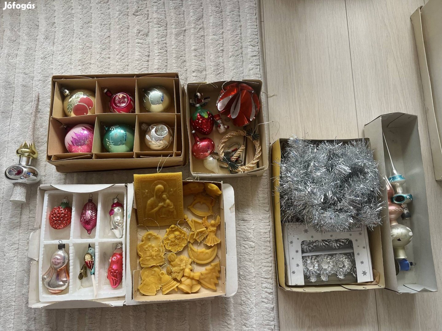 Tartalmaz továbbá 14 db figurás viasz karácsonyfa díszt, boát, bontatlan gyertyacsipeszeket, fa díszt, fólia díszt.