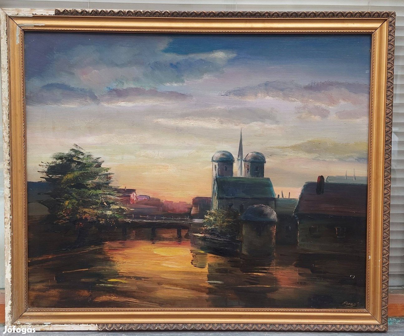 Karap Imre olaj-farost tájkép festmény Városkép este zsűrizett festmén