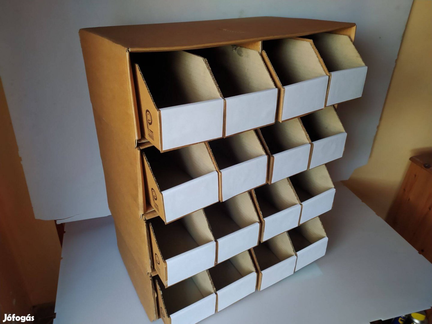 Eladó a képeken látható Karton fiókos tároló rendszer 45x30x15 cm. 4 darab 4 fiókos tároló van. Egy darab ára 1.000 Ft