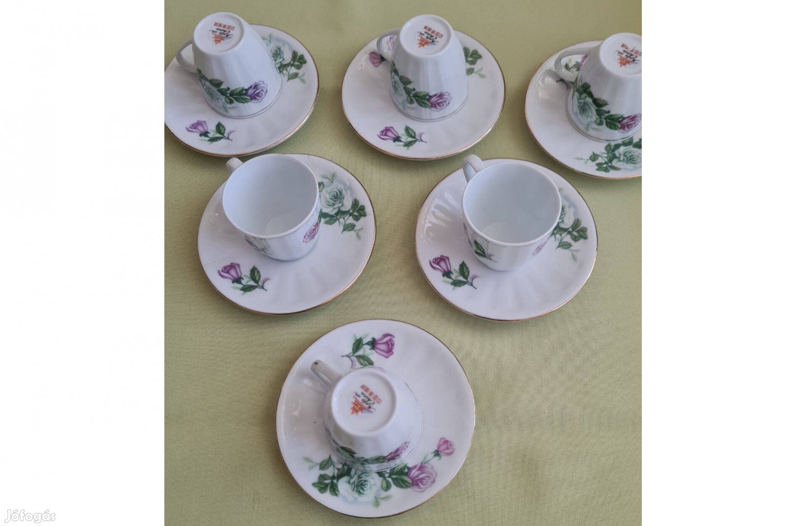 Eladó egy újszerű kávés készlet. Az egyik kistányér szállítás közben elrepedt, de meg lett ragasztva. Fehér színű, virág mintával.