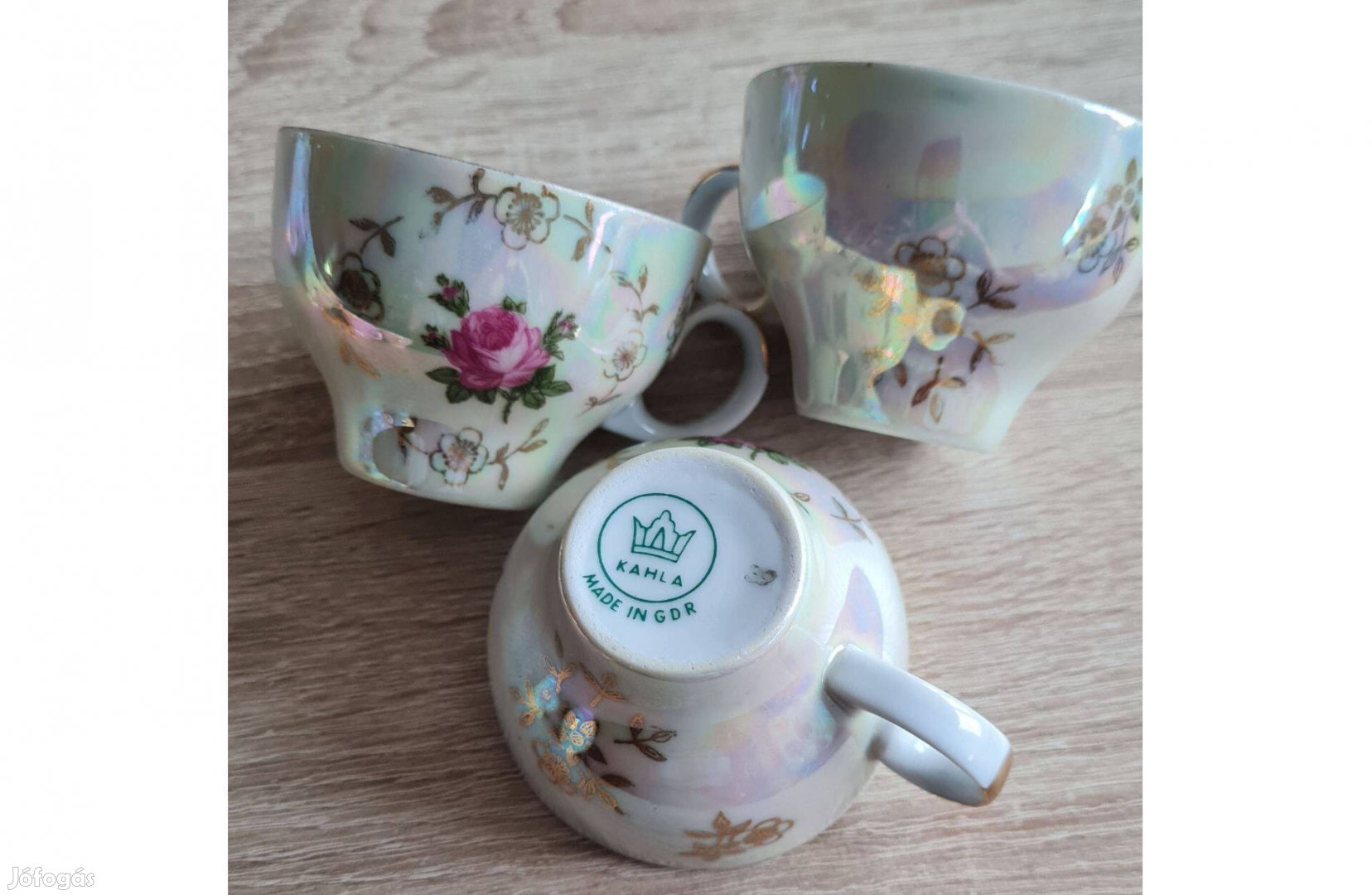 Eladó egy újszerű kávéscsésze készlet. Kahla porcelán, jelzett német. Fehér színű, virág mintával.