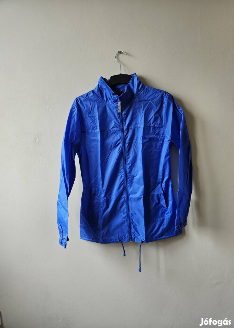 Királykék színű, bélés nélküli széldzseki, elöl két zsebbel. Ebből egy nem zárható, másik cipzáras, bele lehet csomagolni a kabátot.