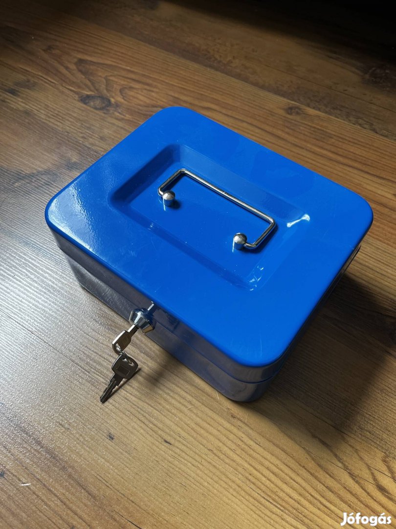 Kék fém pénzkazetta, pénztartó doboz kulccsal