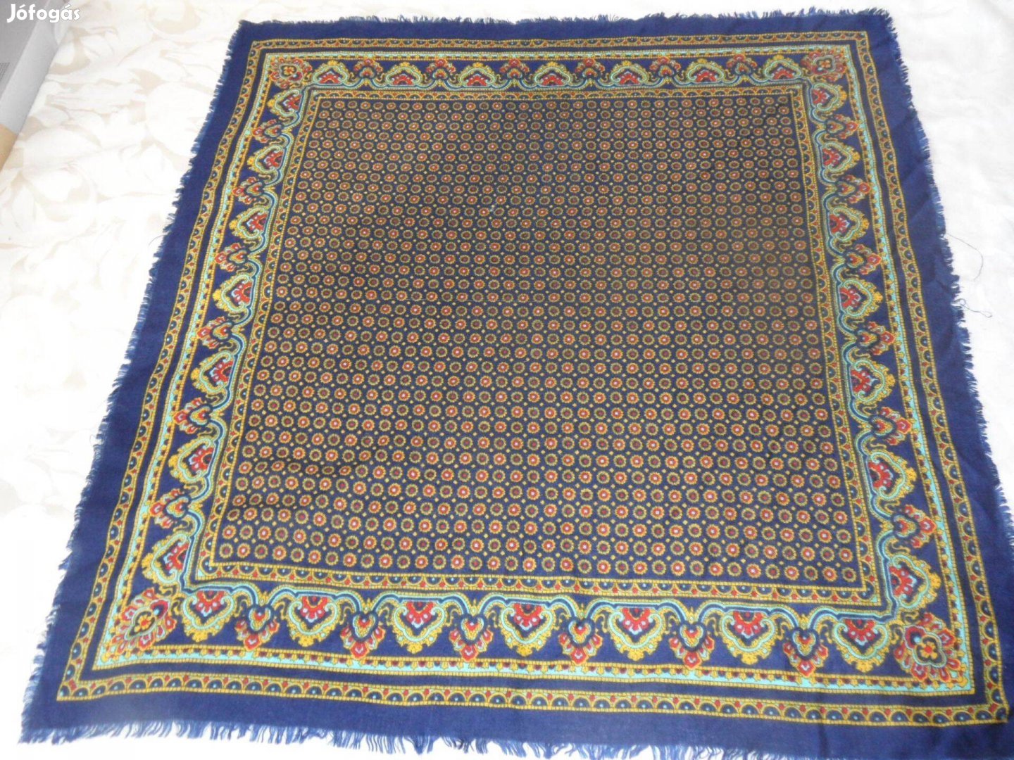 A képen látható kék mintás, kisebb méretű kendő, sál eladó.