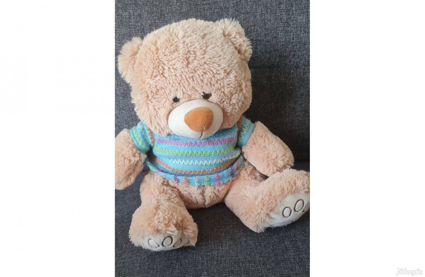 Eladó újszerű állapotban levő drapp színű maci, kék színű pólóba öltöztetve, 35 cm magas.