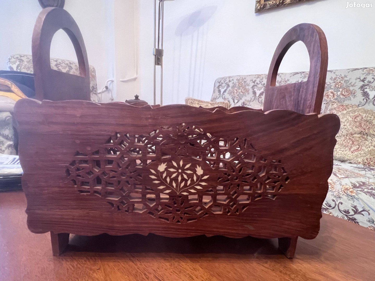 Eladó egy különleges, kézzel faragott fa újságtartó, amely az indiai vagy közel-keleti kézműves művészet jegyeit hordozza. A tárgyat áttört, geometrikus és virágmintás faragások díszítik, a közepén elegáns csont vagy világos fa berakással.