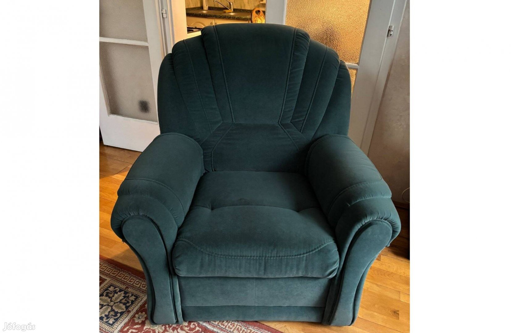 Teljesen új, sosem használt, nagyméretű mélyzöld bársonyos anyagú fotel.