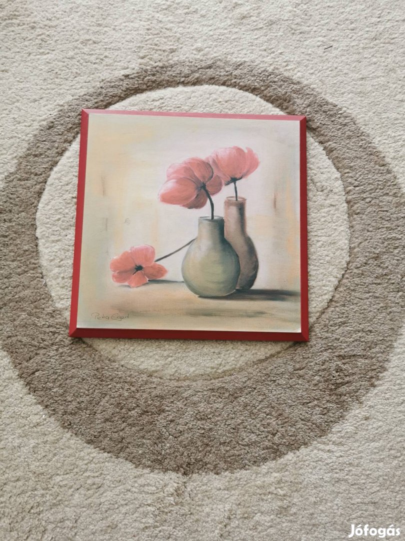 Eladó egy használaton kívüli fa alapra festett kép vâzâban lévő virágokkal.