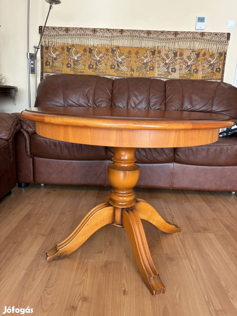 Szép fa rajzolatú cseresznyére pácolt fényes bükk póklábú dohányzóasztal eladó. Átmérője 85 cm, magassága 63 cm. Dohányzás- és kisállatmentes lakásban használtuk. Egy apró sérülés van az asztallapon, ezt fozóztam.