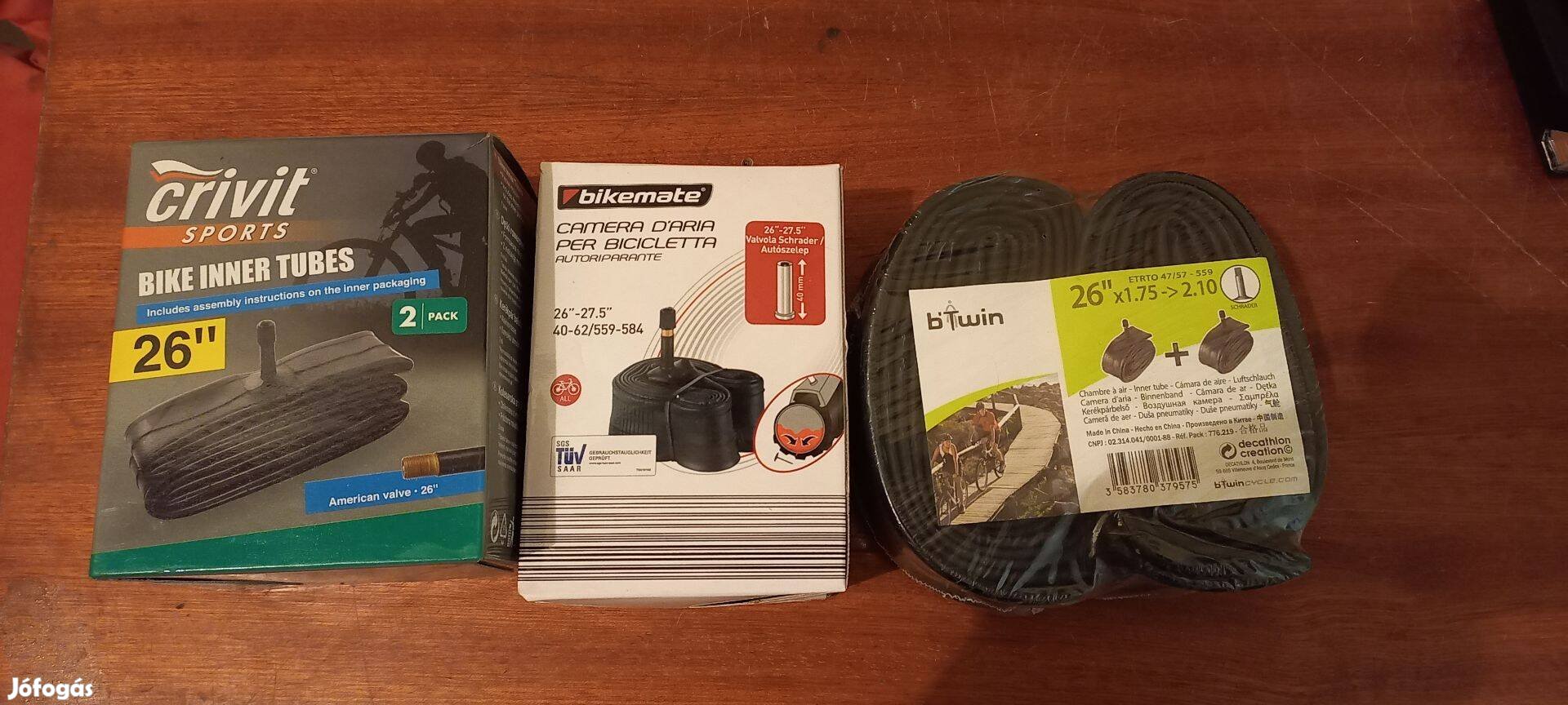 Kerékpár belső 26" méret, Új!!! Crivit - Bikemate és Decathlon. Dobozonként 2 db van benne. Mindegyik autószelepes. Csak egyben eladó személyes átvétel Bp.III.Óbuda. Posta Foxpost!!! Az ár a 6 darabra vonatkozik!!!