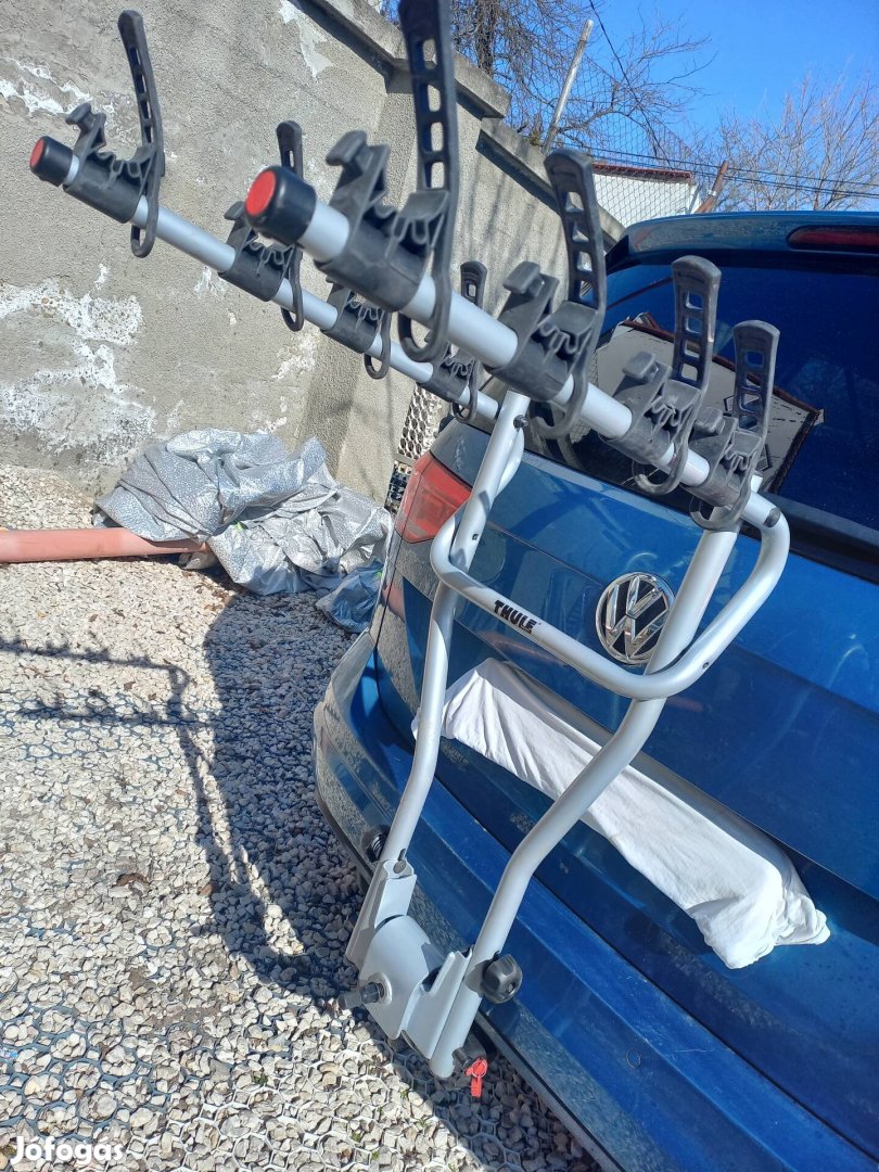 Eladó a képeken látható vonóhorogra szerelhető bicikli szállító, max 4 biciklihez. Teherbírás max 60kg. Nem használtuk, rögzítőcsavart is csak a fénykép miatt vettem ki a zacskóból. Felületi festék sérülést fotóztam.