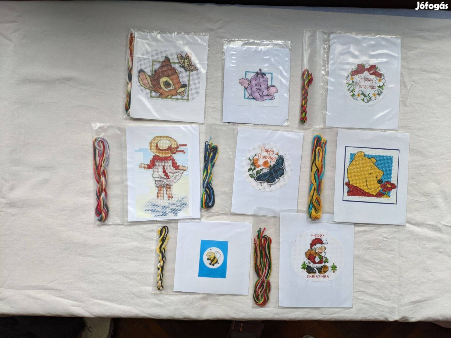 8 db összesen. Keresztszemes minták anyaggal, cérnával és sablon.