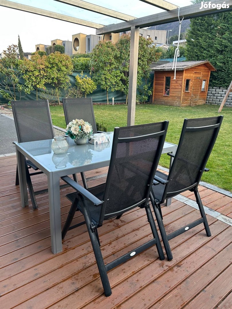 Eladó egy aluvázas üveg kertiasztal garnitúra, 4db dönthető székkel.