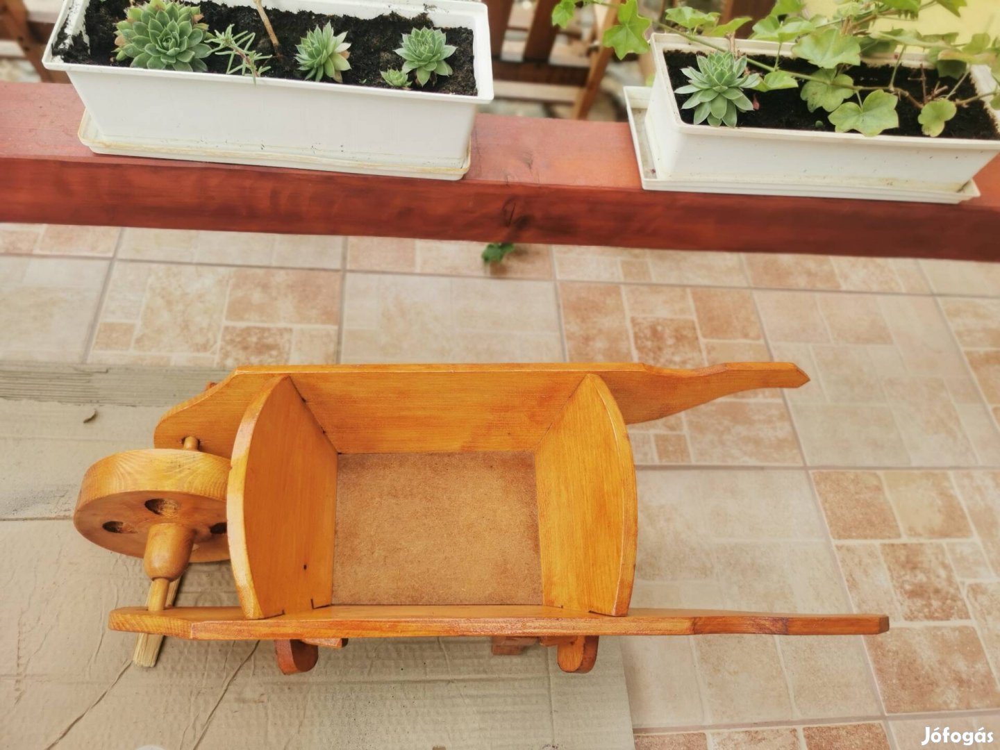 Kihasználatlanság miatt eladó a képen látható kerti talicska, kicsi. Mérete : 36 cm hosszú 28 cm széles 12 cm magas ez a virág tartó része 77 cm a teljes hossz, lenolajjal kezelt, vastag lazurral lefestve, új. Várja új gazdáját.
