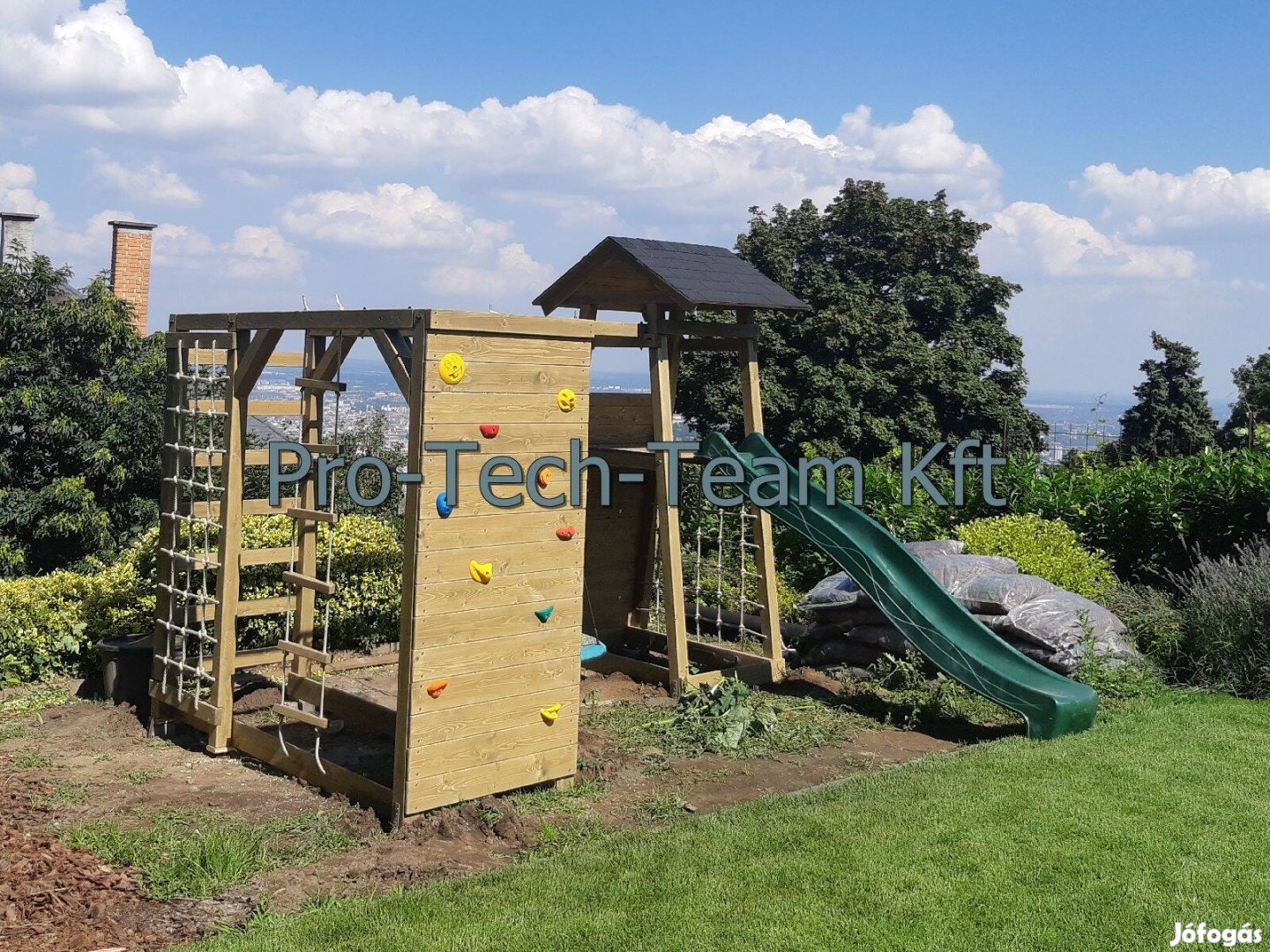 otthoni játszótér a gyártótól . 100x250 alapterületű mászótorony . mászófallal , mászóhálóval , létrával , felső csimpaszkodóval , és kis torony 2 állású mászómodullal